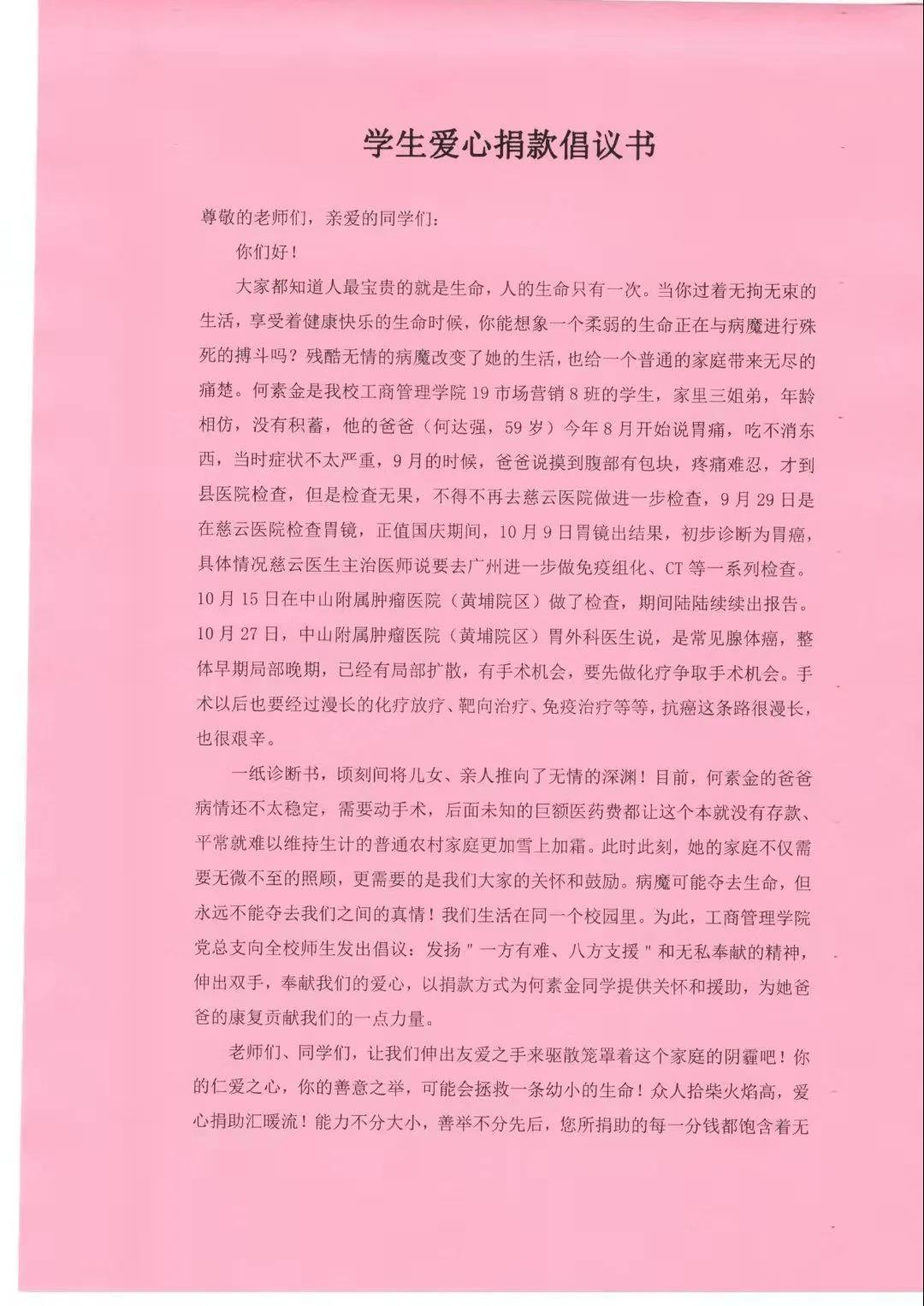 一纸诊断书,顷刻间将儿女、亲人推向了无情的深渊!目前,何素金的爸爸病情还不太稳定,需要动手术,后面未知的巨额医药费都让这个本就没有存款、平常就难以维持生计的普通农村家庭更加雪上加霜。此时此刻,她的家庭不仅需要无微不至的照顾,更需要的是我们大家的关怀和鼓励。病魔可能夺去生命,但永远不能夺去我们之间的真情!我们生活在同一个校园里。为此,公司党总支向全校师生发出倡议:发扬"一方有难、八方支援"和无私奉献的精神,伸出双手,奉献我们的爱心,以捐款方式为何素金同学提供关怀和援助,为她爸爸的康复贡献我们的一点力量。