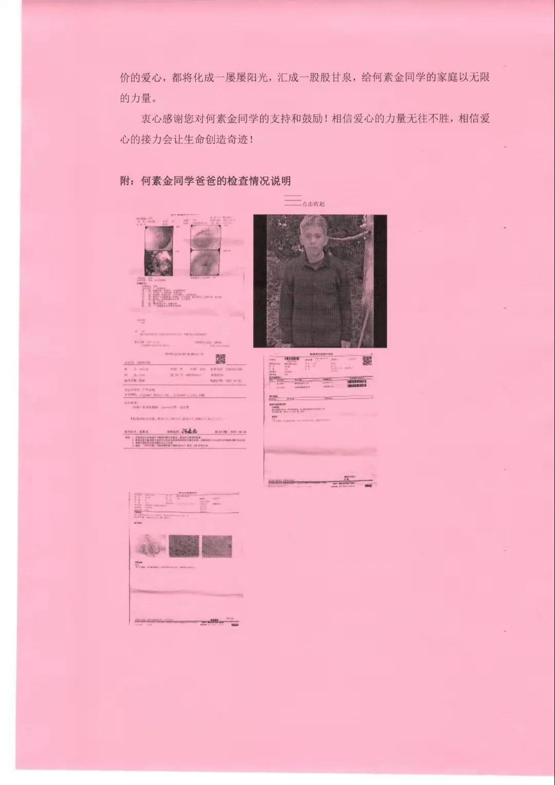 衷心感谢您对何素金同学的支持和鼓励!相信爱心的力量无往不胜,相信爱心的接力会让生命创造奇迹!
