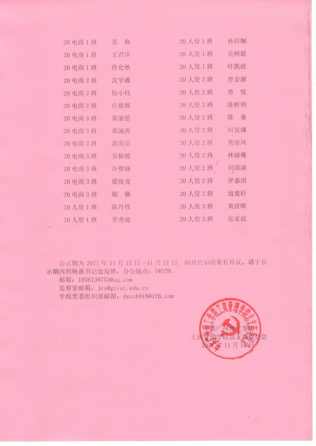 公示期为2021年11月15日—11月21日。如对公示结果有异议,请于公示期内到杨惠书记处反映,办公地点:7#520。