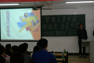 会议开始,全场观看了第九届校运会精彩视频短片。接着由钟清恒主任讲解了校运会期间有关注意事项,体育部部长杨军权作详细补充。最后,运动员代表廖杰勇师兄激动人心的发言把现场的气氛推向高潮。