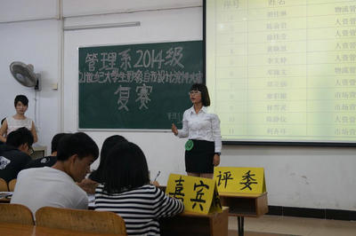 (通讯员 陶曼琪)11月26日晚,管理系2014级“21世纪老员工形象自我设计”演讲大赛复赛在6栋顺利举行。出席本次活动的嘉宾有管理系团总支员工会主席团以及各正副部长。评委有:2013级演讲大赛一等奖获得者刘尘染、二等奖获得者黄学炼、三等奖获得者黄莉。