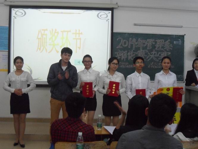 本系讯(通讯员:黄婉莹)2014年3月27日,管理系2014年辩论赛决赛在7栋406隆重拉开帷幕。出席本次辩论赛决赛的嘉宾有:管理系团总支书记钟劲,管理系办公室辅导员秦文飞、林成园以及管理系团总支员工会主席团成员。