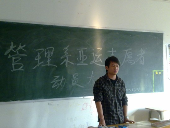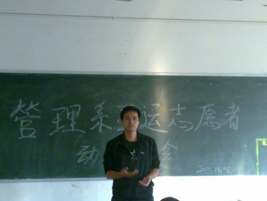 (通讯员 禤美先)11月2号下午,为了让志愿者们认真做好亚运会志愿者工作,管理系党总支专门召开了亚运会、亚残运会志愿者动员大会,管理系党总支书记刘元俊,团总支书记钟清恒和管理系30名志愿者出席了会议。 会上,管理系团总支员工会主席兼中队长叶俊毅首先发言,希望大家要珍惜这次机会,认真负责,维护管理系,天河公告的形象并陈述公司的志愿者工作种类。接着,管理系团总支书记钟清恒发言,强调志愿者队伍的纪律性,要服从指挥,安全高效地完成志愿服务。鼓励志愿者不怕辛苦,坚持和出色地完成任务。最后,管理系党总支书记刘元俊代表系党政领导讲话。他讲了四点:一是要高度注意志愿者本身的人身安全;二是要严格执行纪律,不能随意缺勤;三是要求志愿者在志愿服务期间仍然要搞好学习,做到做好志愿者与搞好学习两不误;四是以身作则,起模范带头作用。在领导的激励下,我系的志愿者们更加坚定信念,确立目标。争取在亚运会、亚残运会期间奉献出自己最大的力量!为广州亚运会争光,为天河公告争光、为管理系争光。