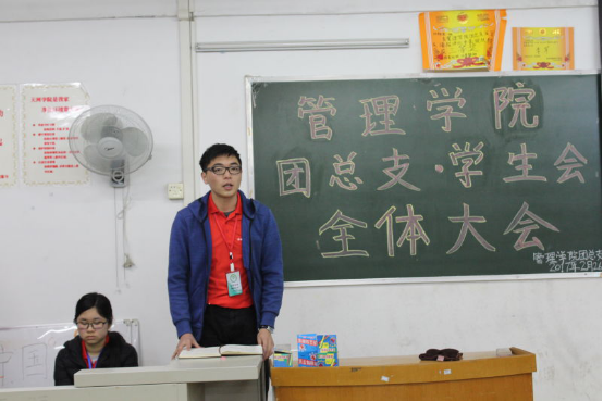 会议分为三个环节。首先,奏唱共青团团歌。接着,由各分管主席上台发言:员工会副主席杨泳仪发言,她表达了自己对本学期员工会工作的期待,提出各部门应当注意培养内部感情,同时也要促进部门间和谐关系的发展;副主席陈静仪发言,她强调了员工工作的主动性,并强烈要求员工会成员应积极地参与各类组织活动;副主席梁晖发言,他同样强调了各部门人员参加活动的积极性,同时要求各部门干事仍当注重礼仪礼貌问题;员工会秘书长潘英权发言,他提出员工会应当重视团结、协助、沟通这三大问题,也要学会利用好员工会这一平台,提升自己的综合实力;团总支副书记兼员工会主席孙李发言,他要求我们要学会合理安排时间,强调各干部要明确自身定位,懂得如何承担责任,同时,各分管主席也为各自所分管的部门强调了本学期所需负责的活动。