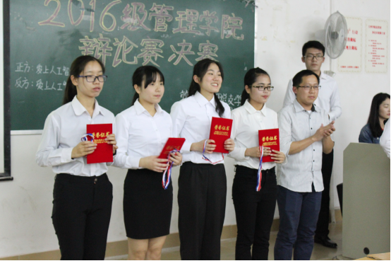 在过去一个多月的角逐中,16人资1班(反方)和16人资2班(正方)在众多队伍中脱颖而出。双方在决赛中以“爱上人工智能算不算爱情”为辩题,在开篇立论、攻辩环节、角色争锋等五个环节中展开了激烈辩论,最终16人资1班(反方)胜出。