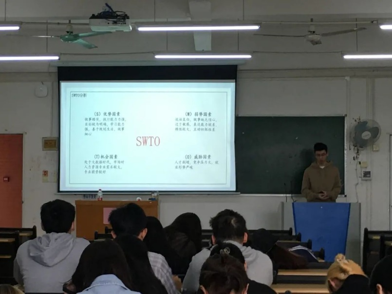 紧接着,各班同学上台演讲自己对学业规划的见解、自身的规划等。演讲讲述的观点主要围绕社会环境规划、专业规划、自我分析、制定短期目标与长期目标以及想成为一个怎样的人等方面展开,同时还列举出自我分析法、SWOT分析法等有效进行学业规划的方法。
