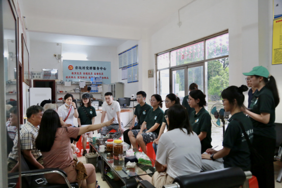 此次调研,太阳成集团tyc151cc公司党总支书记杨惠、学工组长刘丹、团总支书记赵丹丹、张应利辅导员与“语”惠启航队一行人来到青坑村党群服务中心进行访谈,邀请了当地的村委黄副书记和有威望的黄爷爷向老师们与队员们讲解青坑村的历史文化背景与乡村振兴的发展情况。