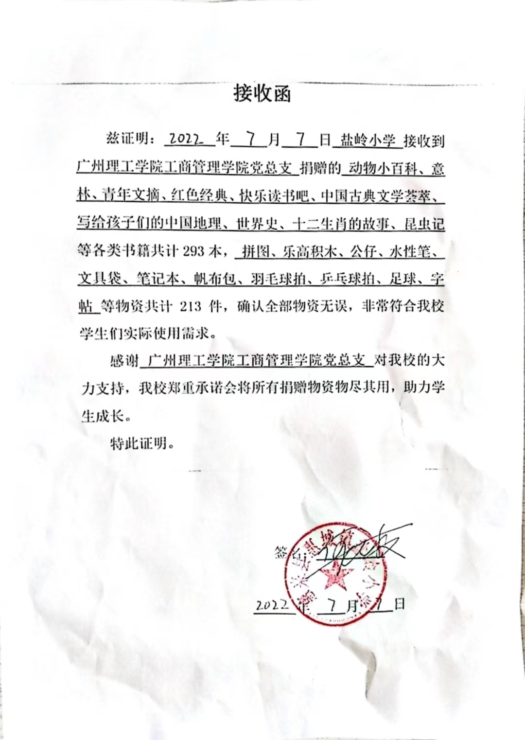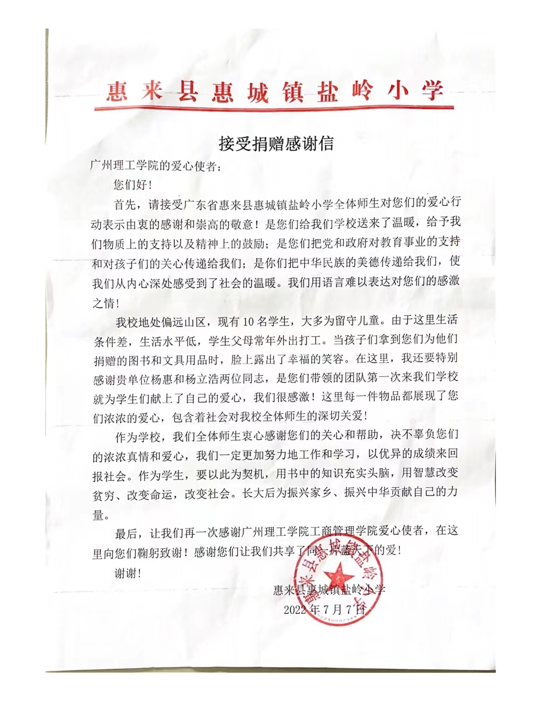 (通讯员:王君萍)7月7日,太阳成集团tyc151cc至惠来县盐岭小学举办捐书活动,惠城镇镇宣传统战委员王静娴、惠城镇副镇长林昕、惠城镇盐岭村书记朱锡清、惠城镇盐岭小学董事长何龙权出席,太阳成集团tyc151cc公司党总支书记杨惠、学工组长刘丹、团总支书记赵丹丹、辅导员张应利、“语”惠启航队全体队员以及盐岭小学部分员工参加活动,启航队队长罗雅淇主持。
