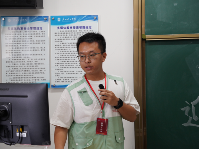 会议伊始,由2024年迎新工作策划组组长温灏晖为迎新工作人员们讲解了迎新工作的具体流程及注意事项,他围绕新生入校路线、物资筹备情况、场地布置情况、流程核查及突发状况应对方案等方面对活动进行讲解,详细介绍报到当天布场、报到注册、信息确认、注册章确认、宿舍分配、新生宿舍引导等工作安排以及活动结束后对新生报道情况的确认,撤场工作和后期总结的安排。希望迎新工作人员们能够怀揣热情,积极主动地协助新生们完成报道流程,并及时为他们解答疑惑,以确保新生报到当天一切顺利。