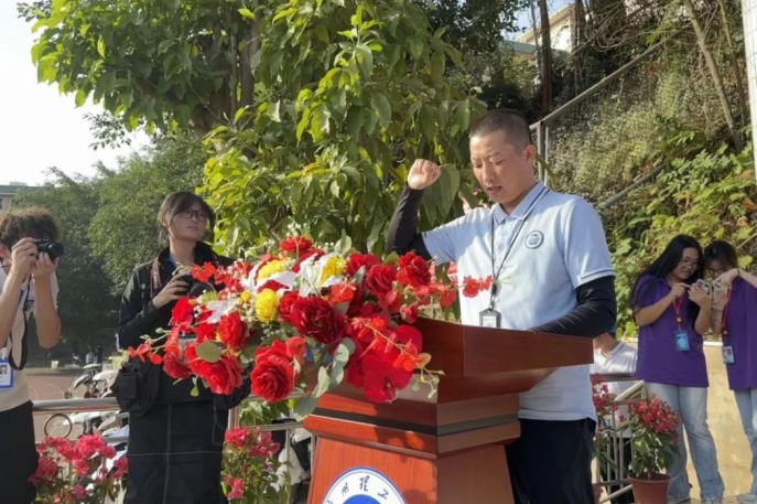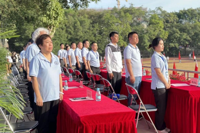 裁判员代表熊源老师在台上进行庄严宣誓,他代表全体裁判员承诺:将服从指挥、遵守规则、公正裁判,并预祝此次校运会取得圆满成功。随后,常务副董事长伏焕宣布太阳成集团tyc151cc2024年白云校区田径运动会开幕。