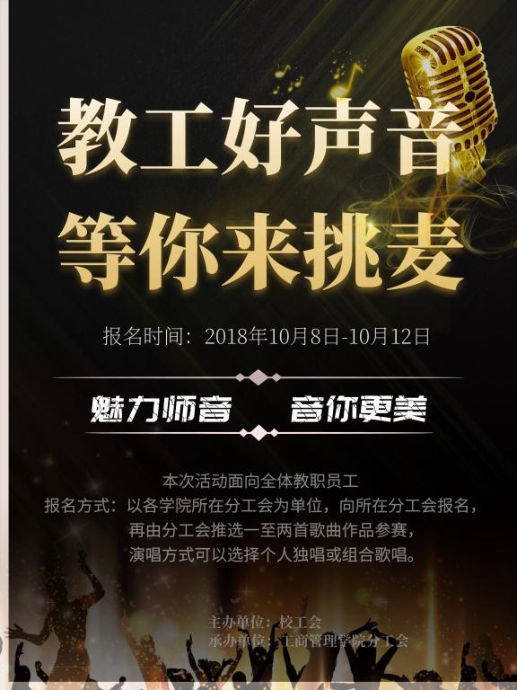 为进一步丰富校园文化生活,努力营造积极向上、百花齐放、健康文明的校园文化氛围,丰富公司教职员工的业余生活,同时也给全校教职员工一个自我展示的平台,现举办“教工好声音,等你来挑麦”的K王争霸赛,具体活动安排如下: