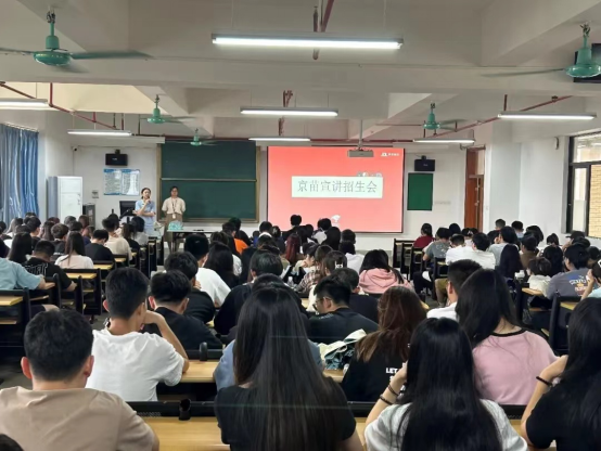 京东代表介绍了京东物流业务板块,同时对巅峰实训进行了讲解,实训过程中会有入职培训、双导师培养制、在岗培养、结业述职表彰等,本次宣讲会有计划A&B供员工选择:实训计划 A:京东华南大件物流客服顾问实训计划、B:京东华南仓储运营一线操作实训。参加巅峰实训的员工都会经历这段培养期,且有机会获得京东正式实习的机会,鼓励同学们积极参与报名。