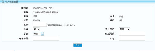 步骤3、进入后出现如下页面,按照提示填入姓名、性别、专业类型、学历、电话号码、电子邮件、qq号后,点击“提交”便可进入测评页面: