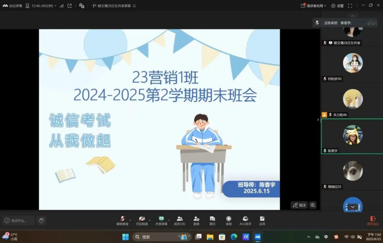 本次“立诚信之帆,扬清正考风” 线上主题班会,进一步增强公司学子诚信意识和纪律观念,营造公平、公正、文明的考试氛围。愿每一位工商学子都能以扎实的知识储备、诚信的态度从容应考,最终取得理想成绩。