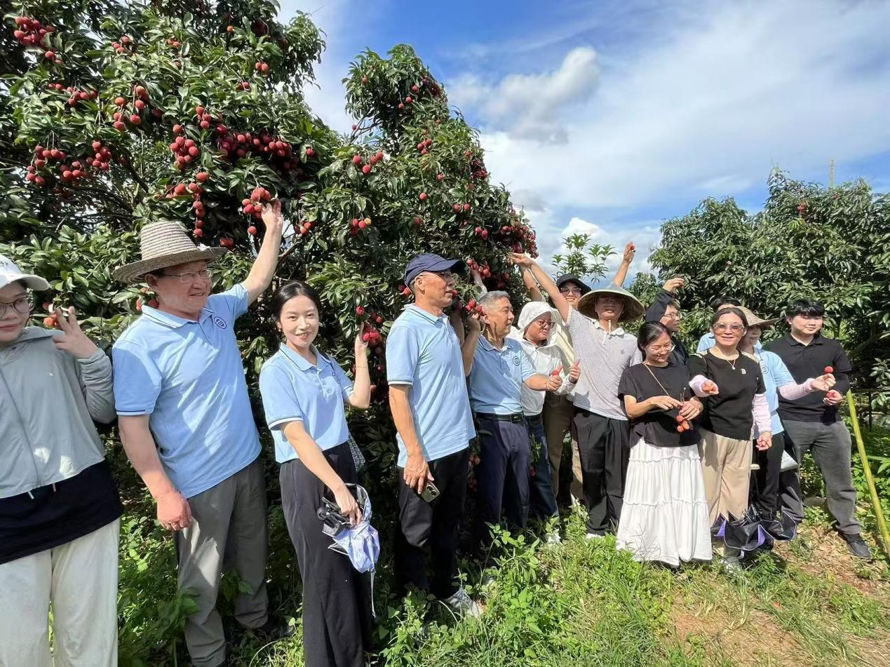 清晨,寿星教师们齐聚增城荔枝文化公园,在郁郁葱葱的荔林中开启了一场别开生面的采摘活动。老师们三两结伴,亲手摘下晶莹饱满的荔枝,欢声笑语间交流采摘技巧,分享岭南佳果的甘甜。党委书记杨惠现场即兴赋诗一首,以"红云满枝头,桃李共此时"寄语教师们如荔枝般硕果累累;经理李培祥更化身"科普达人",为大家讲解增城荔枝的千年文化,寓教于乐中展现工商公告的人文关怀。