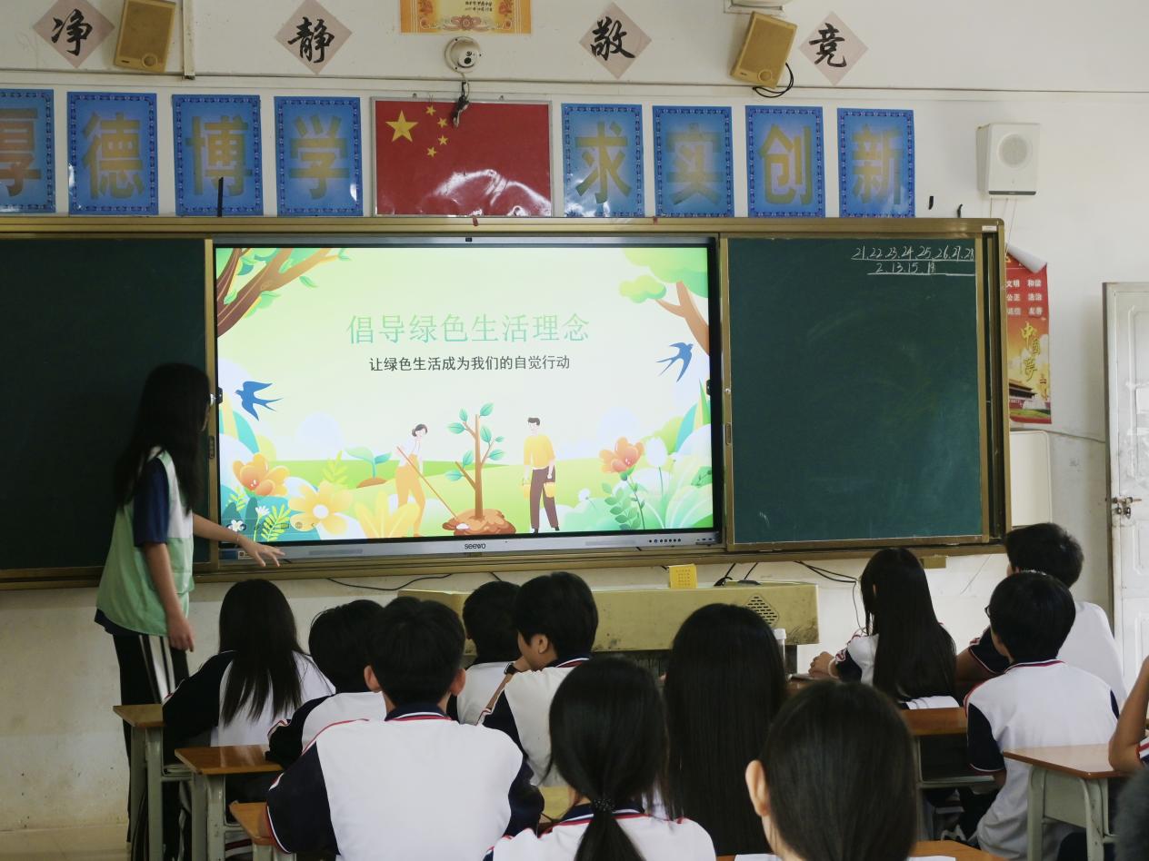 活动伊始,“英韵乡播队” 的队员们通过精心制作的 PPT,向甲秀中学的同学们详细讲解了“绿美广东” 生态建设的内涵与意义。PPT 中,队员们巧妙地将 “绿美广东” 的整体规划与甲子镇的自然风光结合起来。通过对比甲子镇过去和现在的生态环境,同学们深刻感受到了保护环境的重要性,也明白了 “绿美广东” 活动与自己家乡息息相关,是为了让甲子镇的天更蓝、水更清、地更绿。
