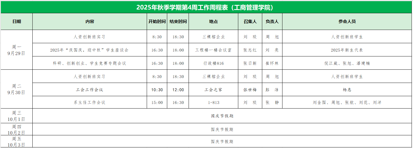 2025年秋季学期第4周工作周程表