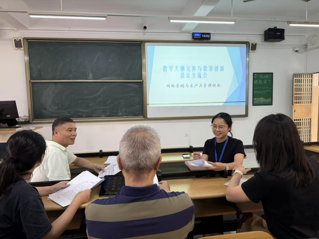 为进一步深化课程教学改革,提升课程建设质量与教师教学设计能力,9月18日,网络营销与客户关系课程组以“教学大纲优化与教案创新设计”为主题,组织开展了专题教学研讨会。会议由课程组组长陶思老师主持,组内全体教师参会,围绕核心课程的大纲修订与教案创新展开深入交流,为本学期课程教学质量提升奠定坚实基础。