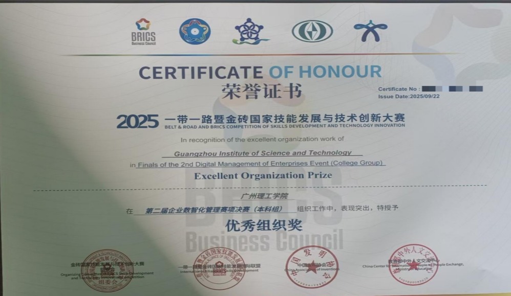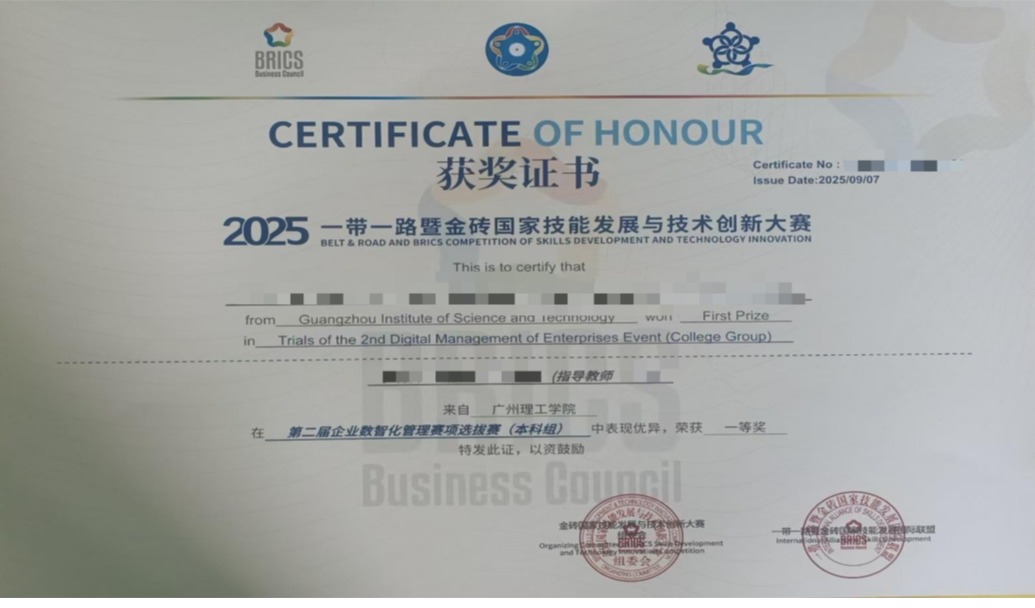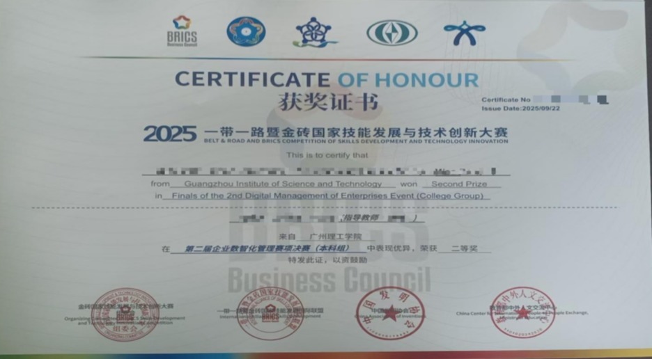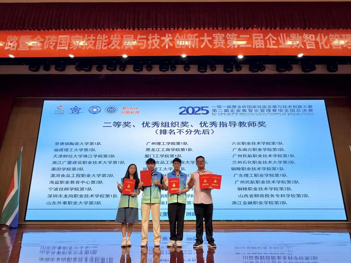 由胡丽美、陈健诚、尹乔烽三位同学组成的“广理砺锋剑”队在苗增老师指导带领下奔赴赛场,团队凭借着扎实的数据分析能力,出色的决策运营水平和默契的团队协作竞赛,最终斩获全国总决赛二等奖(银牌),指导老师苗增获评“优秀指导教师”,公司荣膺“优秀组织奖”。这三项荣誉,既是对师生团队卓越表现与辛勤付出的直接肯定,也是对公司在组织保障与人才培养方面扎实工作的充分认可。
