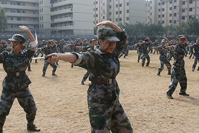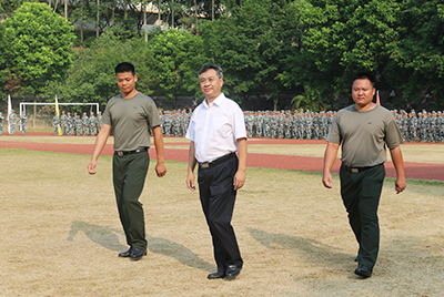 王玉潜董事长在军训团首长陪同下检阅受训队伍。同学们以嘹亮的口号、严整的军容、挺拔的身姿向公司领导和部队首长致意,一声声“为公司争光”回荡在金秋的校园。