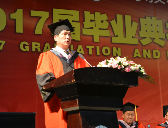 毕业生代表李锦栋发言,表达了对领导、老师致以衷心的感谢和对同学表示衷心的祝贺和诚挚的祝福,接着,他回忆了大一的纯真时代、大二的轻舞飞扬、大三的紧张忙碌、大四的艰苦奋斗,讲述了老师对他的帮助和同学的热情友爱,同时,他承诺毕业生们在未来仍会秉承“学用心智、行知诚明”,运用所学知识,勤于实践、踏实做事,为母校争光添彩,以回报社会,回报母校,最后表达了对领导老师以及同学的美好祝愿。