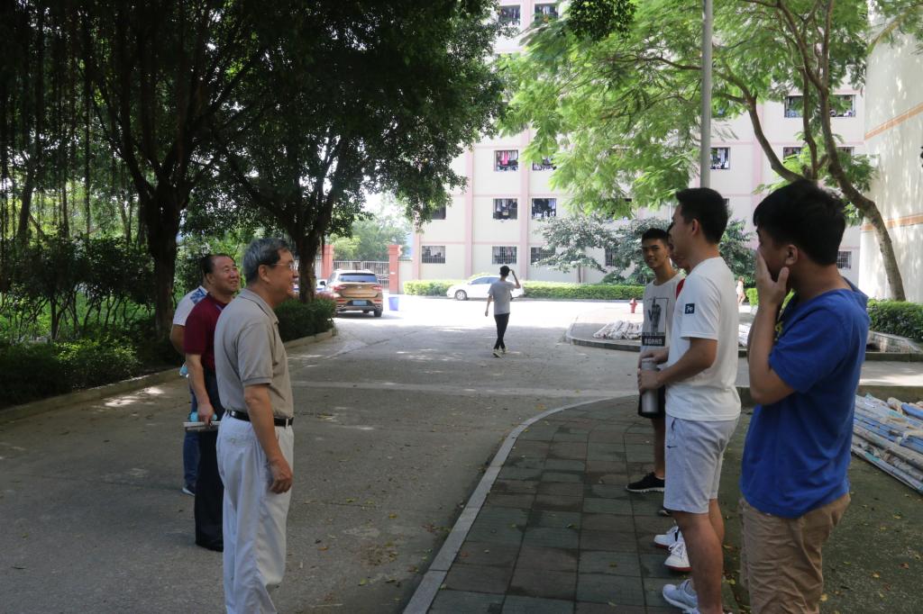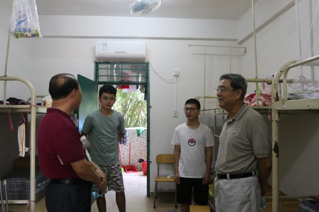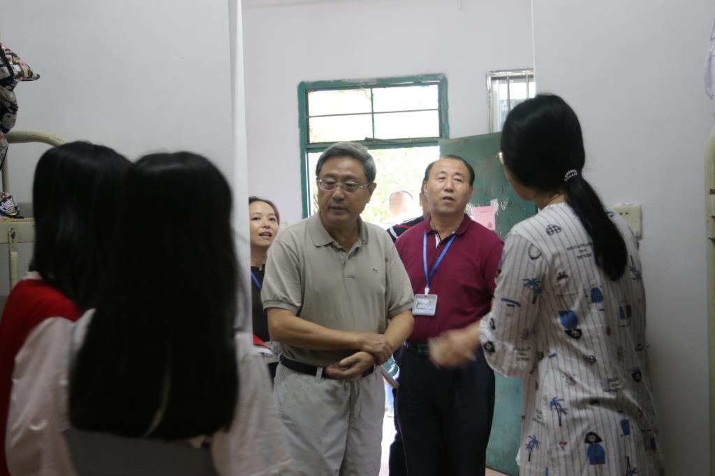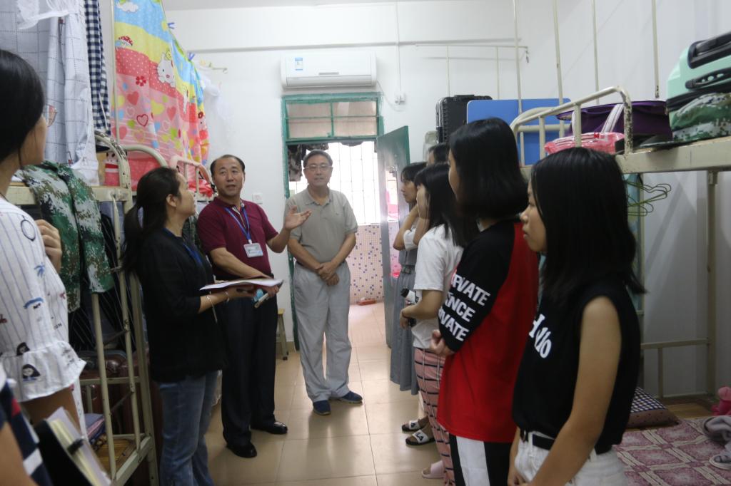 9月9日,星期日。胡社军董事长和肖海副书记走进员工宿舍区,检查住宿、饮食、卫生、医疗、运动场所,探访大一新同学和家长,走访部分老生宿舍。
