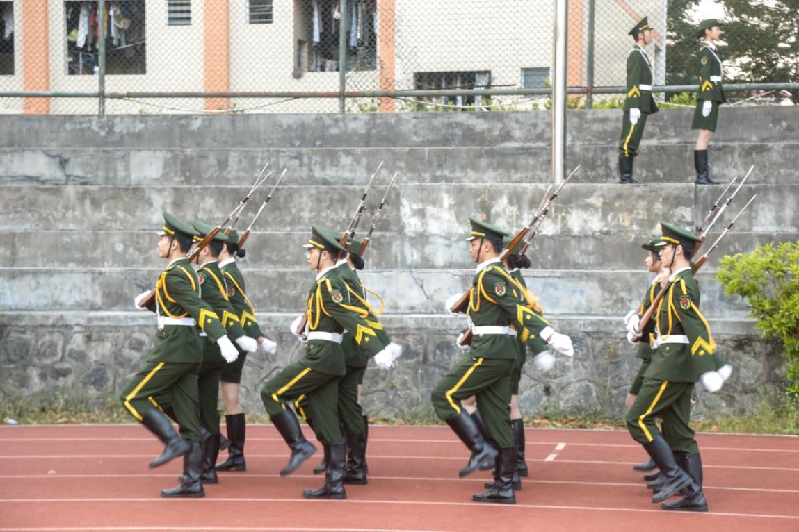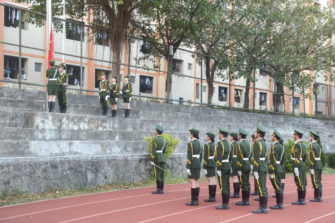 坚定整齐的步伐,响亮有力的口号,在国旗护卫队铿锵有力的脚步声中,鲜艳的五星红旗被护送到升旗台前。