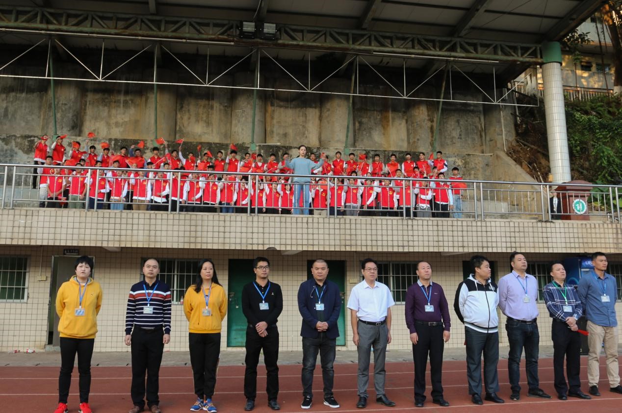 在场的领导及师生代表庄严站立,面向五星红旗齐声高唱国歌,注目鲜艳的五星红旗,它正迎着朝阳冉冉升起。
