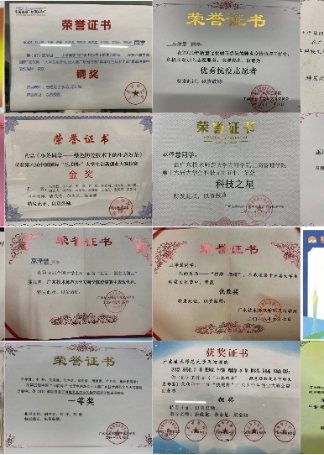 她在校期间获得国家励志奖学金;广东省疫情防控志愿者;《中国茶人秀》大赛亚军;第十五广东省老员工年度人物;第八届“感动南粤校园”广东老员工年度十大人物;校创新创业特等奖;学科竞赛之星;校二等奖学金、三好员工;优秀抗疫志愿者;优秀共青团员;老员工暑期社会实践优秀“调查报告”、“先进个人”等。