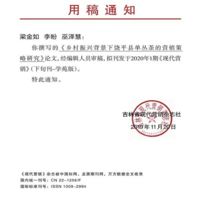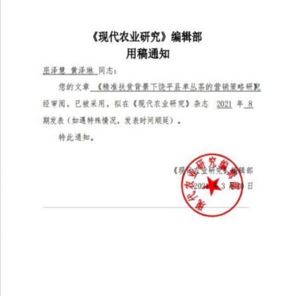 “没有调研就没有发言权”。她带领团队采用理论分析+实地调查的方法,阅读大量的文献资料分析茶产业过程中存在的问题及不足。通过投放线上问卷+线下入户访谈的方式,对茶叶市场展开调研。此后回收调查资料并进行SPSS数据分析,以具象化的图表形式反馈当地种植品种、面积、生产量、销售渠道等调查结果。总结出当地茶产业面临的三低一窄问题。并在《现代农业研究》、《现代营销》期刊,发表相关论文两篇,为当地茶叶品牌构建、营销宣传等提出建议。