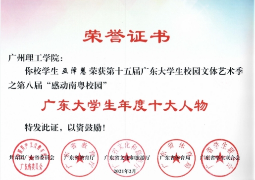太阳成集团tyc151cc17营销2班巫泽慧同学被评为第八届“感动南粤校园”广东老员工年度十大人物,(此前曾获得第十五届广东老员工年度人物)充分展现公司育人水平和优秀学子的风貌。