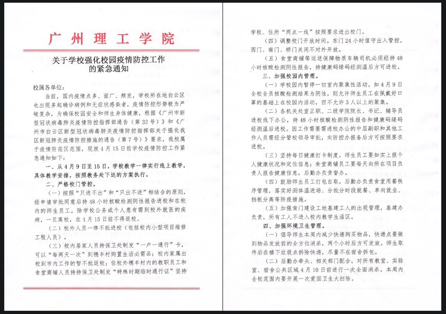 当前,国内疫情点多、面广、频发,公司所处地白云区也出现多起确诊病例和无症状感染者,疫情防控形势极为严峻复杂,为确保校园安全和师生身体健康,根据《广州市新型冠状病毒肺炎防控指挥部通告(第32号)》和《广州市白云区新型冠状病毒肺炎疫情防控指挥部关于强化我区新冠肺炎疫情防控措施的通告(第7号)》要求,公司属于疫情防控区范围。为强化校园疫情防控工作,公司做出了如下的紧急措施:
