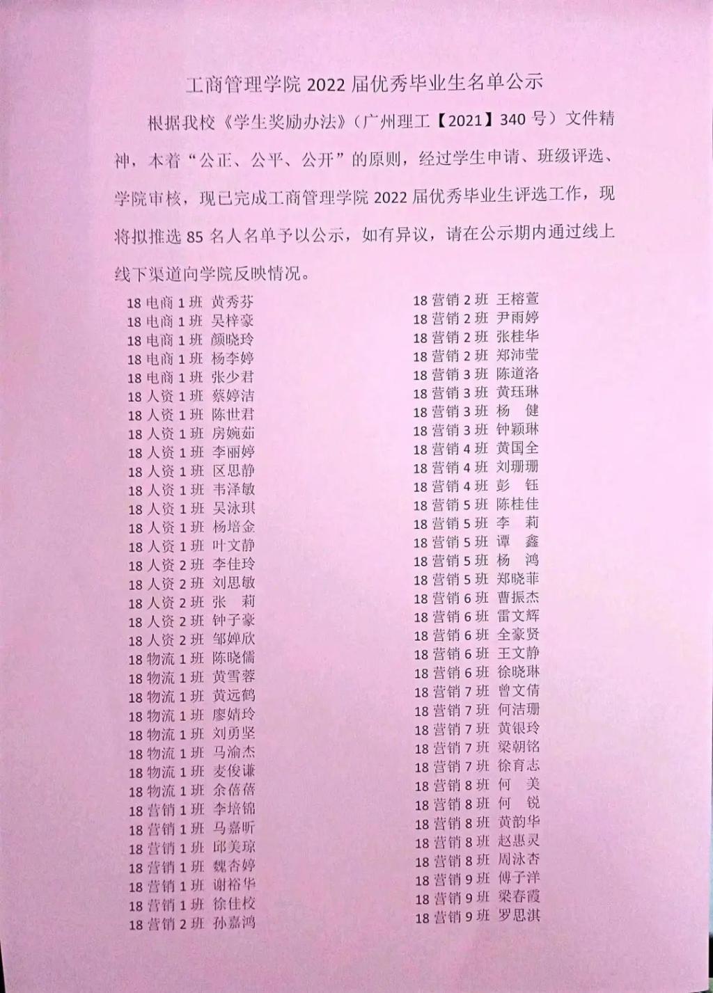 根据公司《员工奖励办法》(广州理工【2021】340号)文件精神,本着“公正、公平、公开”的原则,经过员工申请、班级评选、公告审核,现已完成2022届优秀毕业生评选工作,现将拟推选85名人名单予以公示,如有异议,请在公示期内通过线上线下渠道向公告反映情况。