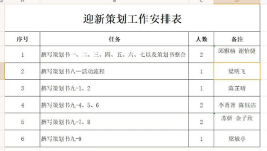 迎新工作组成员:罗雅淇、谭桃一、文家俊、温永荣、邹怡清、张小璇、邱雅楠、苏妍、余子欣、李菁菁、谢怡捷、陈钰洁、陈芷晴、梁敏亭、梁明飞。该策划组成员分工明确、认真负责,他们打通策划中的各个节点,衔接好各部分工作,力求做到最好。