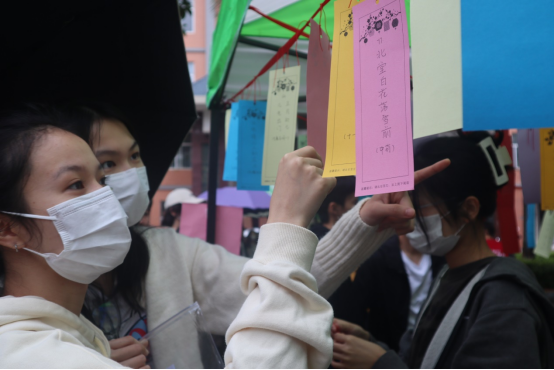 活动开始前工作人员精心布置活动场地,将一条条红色丝带相连,党史字谜跃然于纸上,隐隐描绘出先辈革命故事,营造浓厚的活动氛围。活动在工作人员讲解活动规则与各个项目奖品的兑换方法以及注意事项之后拉开帷幕。猜字谜学党史,活学活用入人心。活动一开始现场便热闹非凡,琳琅满目的字谜,引得大家不断驻足观看。字谜前的人潮拥挤,思绪闪烁,不断推动着活动气氛,同学们一次次大胆猜想与工作人员一声声耐心回应环绕着整个活动现场。同学们一次次的猜谜,激发了求知欲,锻炼了创造性思维,引起了好奇心,提高了理解、表达能力。一张张谜语考验着同学们的智慧和知识储备,一个个谜题把他们带入有趣而浩瀚的知识海洋之中!同学们在猜谜语的过程中,积极思考,共同探讨,共同体验字谜带来的乐趣,现场处处洋溢着浓郁的文化气息。