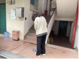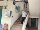 陈晓铭和颜泽珊同学清洁雨后的楼梯以防同学们滑倒