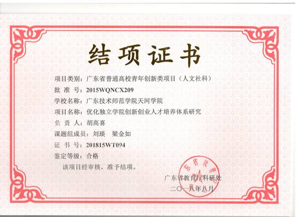 近日,公司胡高喜老师主持的2015年广东省普通高校青年创新类项目(人文社科)“优化独立公告创新创业人才培养体系研究”经广东省教育厅审核,准予结项,并颁发结项证书。