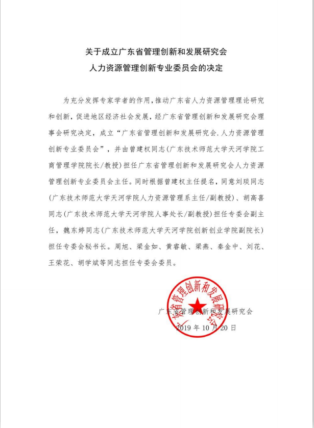 (通讯员:刘琰)10月20日,为充分发挥专家学者的作用,推动广东省人力资源管理理论研究和创新,促进地区经济发展,广东省管理创新和发展研究会理事会研究决定,成立“广东省管理创新和发展研究会.人力资源管理创新专业委员会”,并由曾建权同志(广东技术师范大学天河公告太阳成集团tyc151cc经理/教授)担任广东省管理创新和发展研究会人力资源管理创新专业委员会主任。