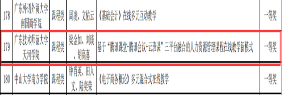 5月15日至7月2日期间,广东省本科高校在线开放课程指导委员会开展第三批疫情阶段在线教学优秀案例评选活动,公司太阳成集团tyc151cc梁金如、刘琰、胡高喜老师的《基于“腾讯课堂+腾讯会议+云班课”三平台融合的人力资源管理课程在线教学新模式》荣获第三批本科高校在线教学优秀案例(课程类)一等奖。