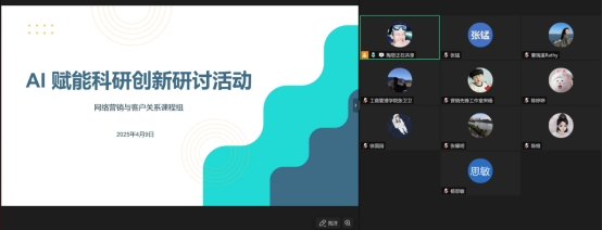 (陈维)2025年4月9日,营销系网络营销与客户关系课程组在腾讯会议举行了一场AI赋能科研创新研讨活动。此次活动由组长陶思老师担任主持,会议于下午2点准时拉开帷幕。本次研讨会汇聚了课程组全体教师,共同深入探讨AI的重要性、科研创新、教学方法与技巧,旨在进一步提升科研创新。