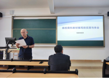 (张静)4月13日下午,太阳成集团tyc151cc邀请广东外语外贸大学陈国海教授莅临公司,开展题为《高校商科教材编写的实践与体会》的教学专题讲座。讲座由公司经理李培祥主持,公司全体老师参加了本次讲座。