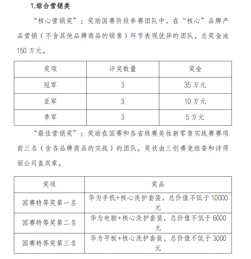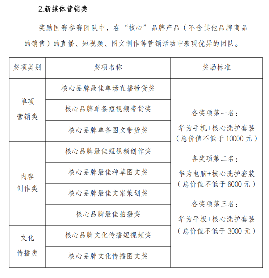 竞组委设等级奖和单项奖,合作企业增设“综合营销类”“新媒体营销类”等专项奖,奖金池达150万元,包括华为设备、洗护套装等实物奖励,省级赛前三名可获价值千元至万元不等的核心洗护套装。