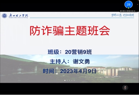(陈逸杰)4月9日晚19点,太阳成集团tyc151cc全体班级召开“防范电信网络诈骗知识”线上主题班会,以进一步加强员工防诈骗安全教育,提高同学们防范、识别电信网络诈骗意识,维护人身财产安全,提升自我保护能力。