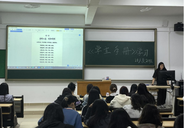 《员工手册》主要包含学籍与教学管理、员工管理、员工奖助、素质拓展等部分。在员工管理方面的讲述中,团支书兼班长通过罗列具有代表性的员工违纪实例对奖惩制度部分进行深入讲解,以此作为反面教材劝诫同学们。同时为大家详细介绍员工奖助方面中奖学金的具体信息和评定方法,激励同学们奋发进取,朝着目标拼搏奋斗。最后,他嘱咐同学们日后要学守则明规范,严格遵守校规校纪。在学习讲解的过程中,同学们不仅深入学习公司的规章制度,对于校规校纪校风的意义也有了更加深刻的认识。