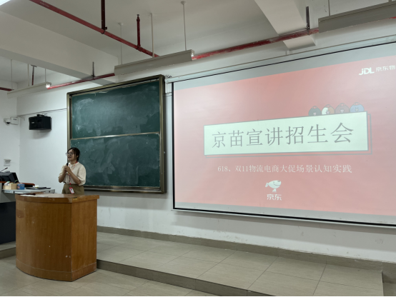 宣讲会上,主持人介绍了到场的京东物流华南总部的工作人员以及京东校企合作人。马丽华经理进行了实训介绍,利用京东物流曲线图向同学们介绍京东的成立以及发展历程,加强了同学们对京东公司的了解。