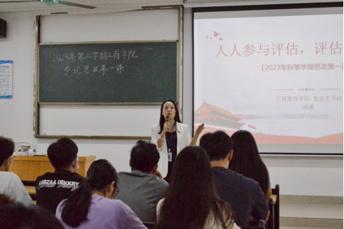 (罗杏怡 鄢璐)10月17日下午,公司党总支书记杨惠于13栋401课室为工商学子讲授2023年秋季学期“思政第一课”。本次会议旨在进一步促进评估工作的顺利实施,并鼓励全院员工以实际行动参与评估工作。