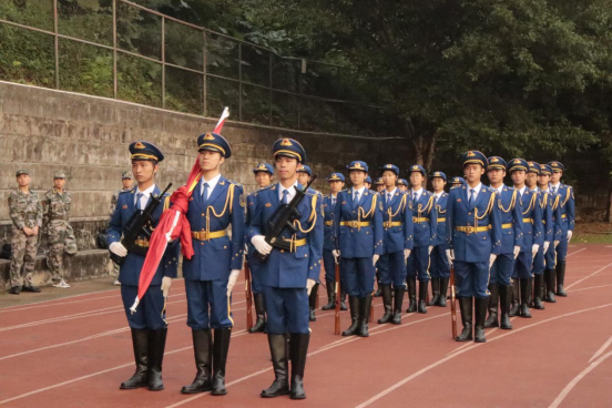 早上7点,升旗仪式正式开始。在全院师生的注目下,国旗护卫队队员们迈着铿锵有力的步伐护送着国旗走向升旗台,整个场地肃静无声。伴随着国歌的奏响,升旗手神情肃穆地将国旗缓缓地升至顶端,全体师生肃立,面向国旗,庄重地唱起国歌,向国旗行注目礼。