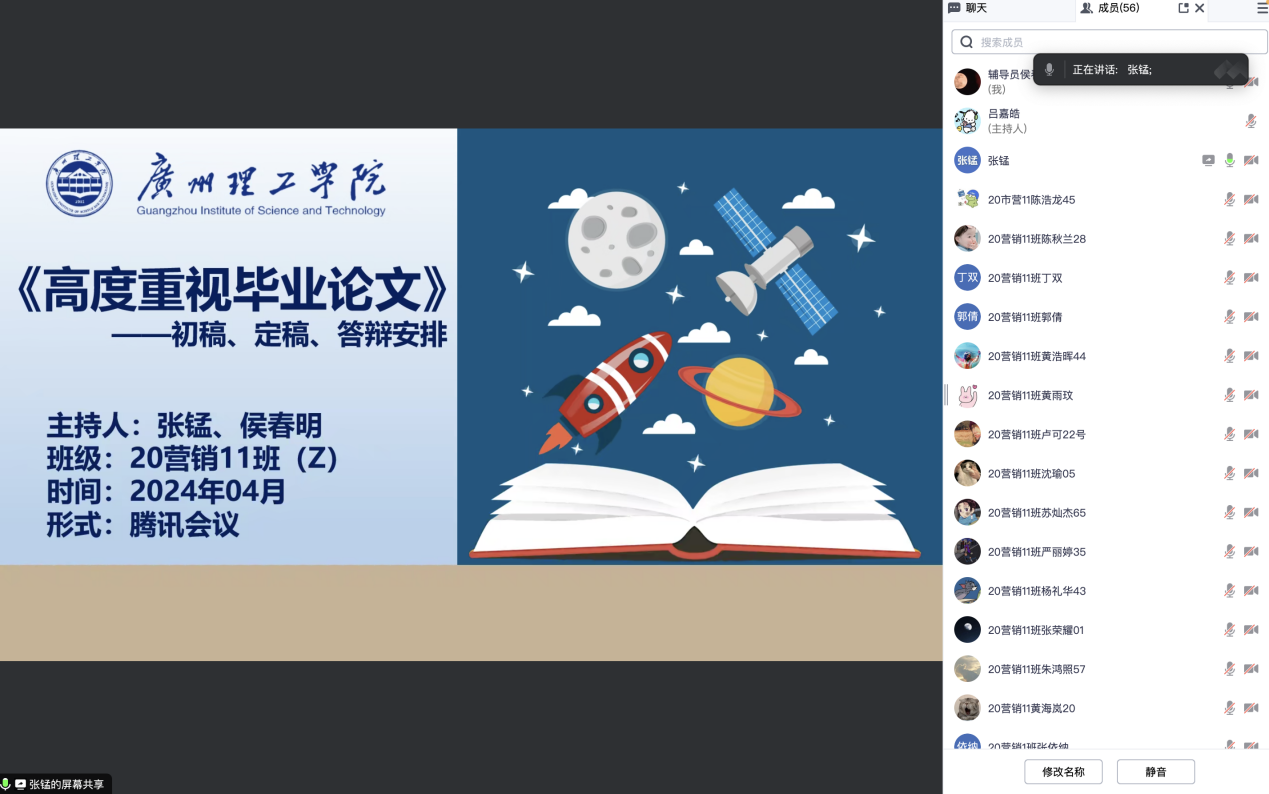 (侯春明)4月10日,班导师张锰老师和辅导员侯春明老师通过线上会议为20营销11班毕业班开展了毕业生就业指导会。此次会议旨在帮助即将走出校门的毕业生们更好地适应市场需求,提供有效的求职策略,助力他们顺利开启职业生涯,同时加强毕业生论文管理工作,指导他们早日完成毕业论文。