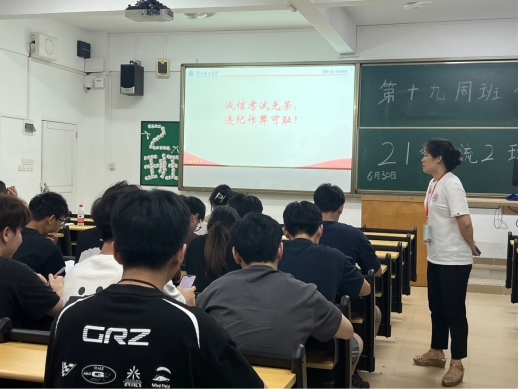 各班主讲人向同学们讲解未来一周的工作内容。首先是临近期末放假,同学们离开宿舍前务必拔掉所有的用电器,关好水、电总闸,锁好门窗,贵重物品带回家,回家途中注意安全。第二,本次班会再一次强调“遵纪守规,诚信应考”,对于下周有考试的班级,要继续做到诚信考试。第三,公司要求各班级在7月3日上午10点前完成暑假去向登记。因暑假期间员工宿舍区施工,为了同学们的安全未经批准不得留校。