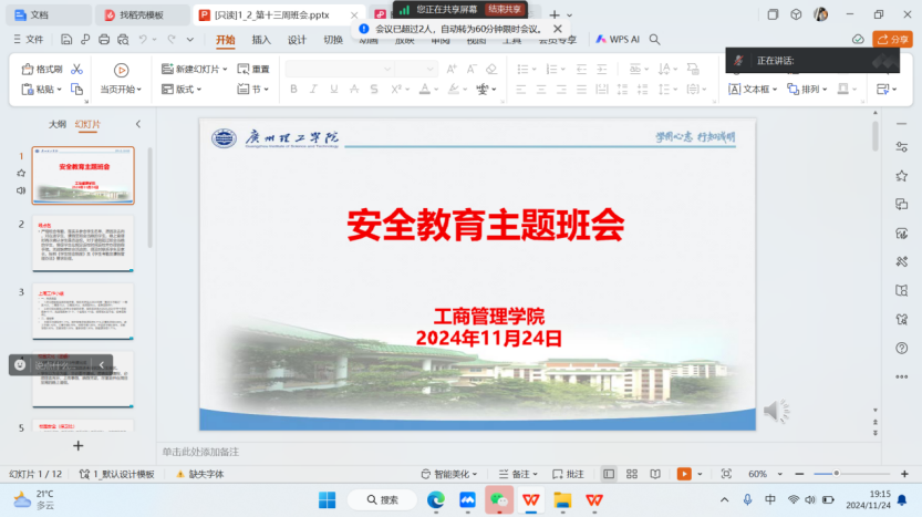 (刘星)11月24日晚,公司组织各班班委开展安全教育主题班会。本次会议旨在强化员工安全意识和守则意识,为构建和平有序的校园添砖加瓦。